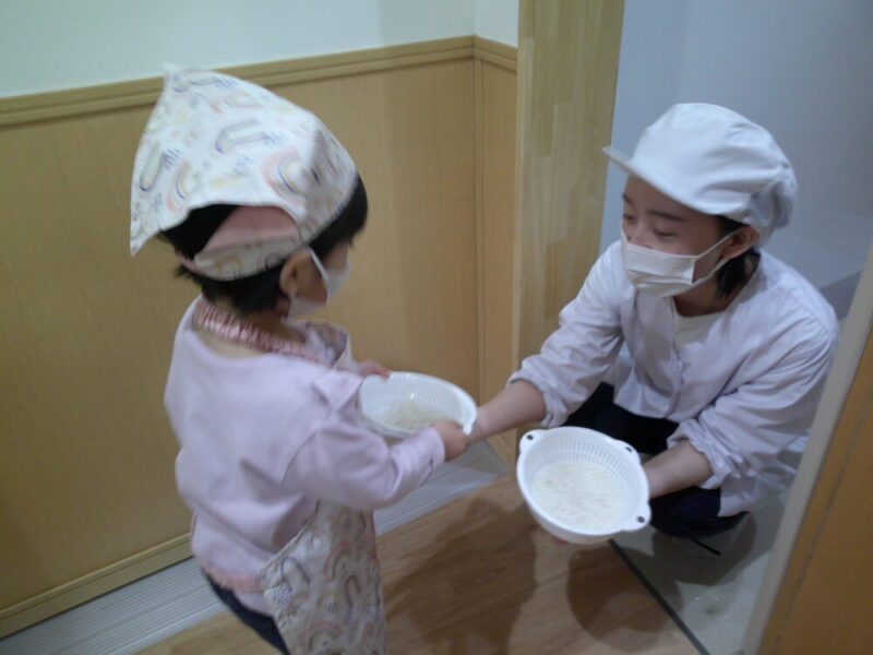 お米研ぎが終わり、代表のお友だちが調理室まで持って行ってくれました!