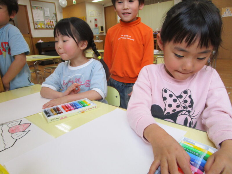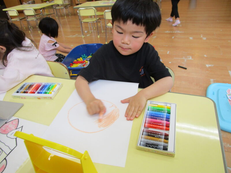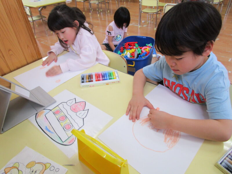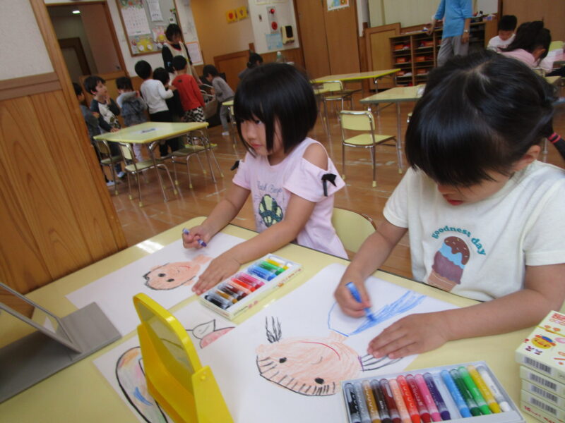 初めに取り組んだことは自由画です。「どんな絵を描こう」と悩みながらも、さすが年長さん。上手に描けて保育者に何を描いたか教えてくれました。