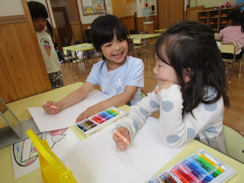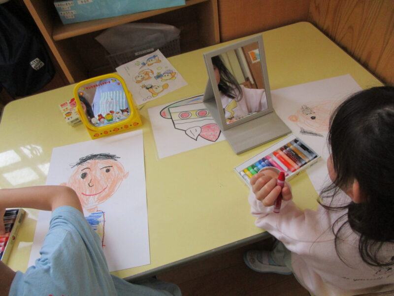 次に自分のお顔を描きました。鏡を見ながら「目は2つ、口は赤」と確認しながら描いていました。