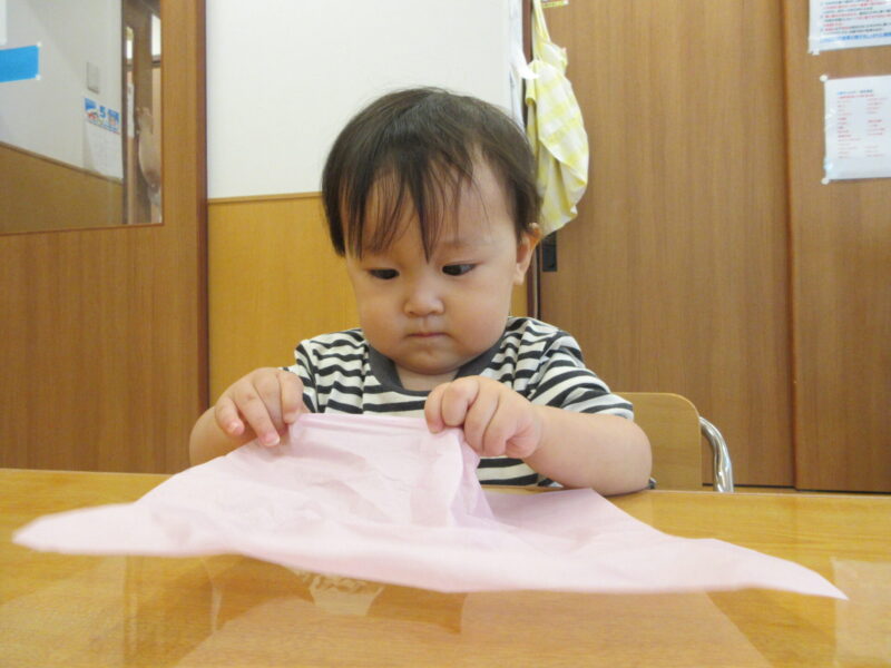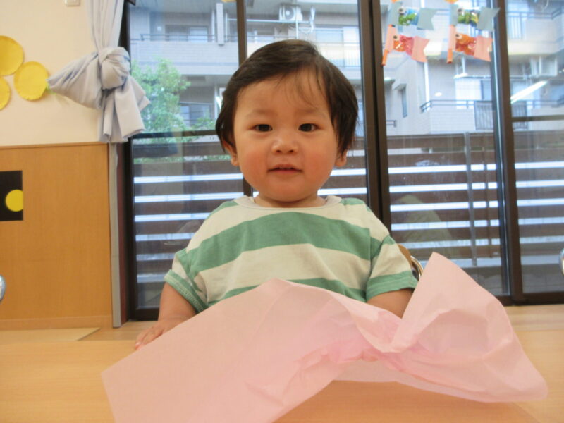 保育者の真似をしてくしゃくしゃに真似ることができる子どもや、ビリビリを楽しむ子どもたち。