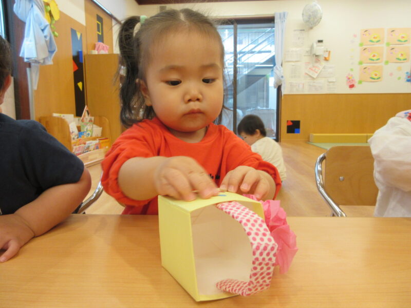 丸めた花紙は保育者がお花に見立てて、小物入れに貼り付けました。