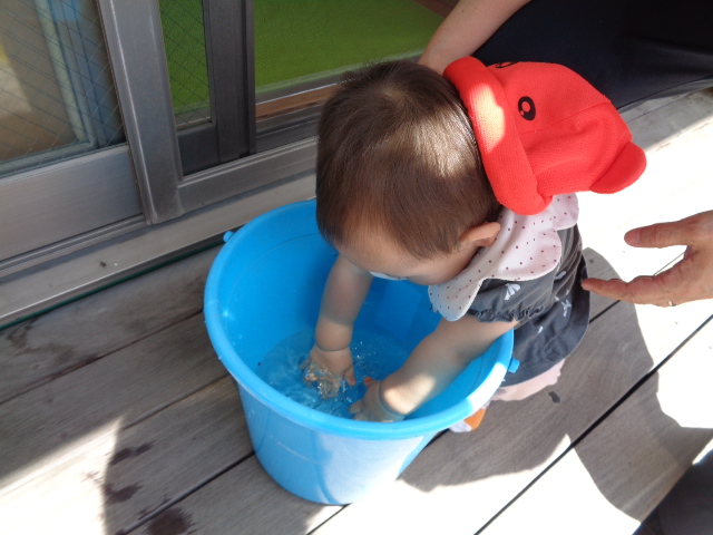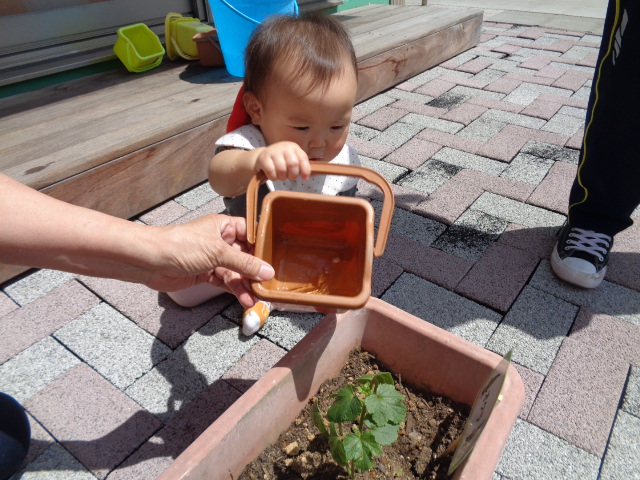 水をやりながら、葉っぱ🍃を触ったり土いじりが始まり、最後は手を洗う水で水遊びが始まりました。