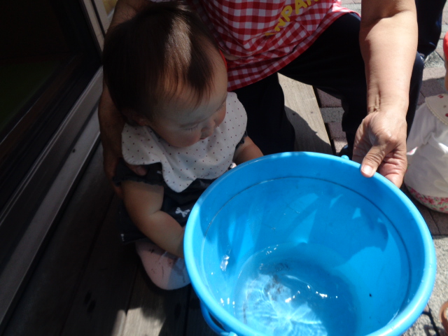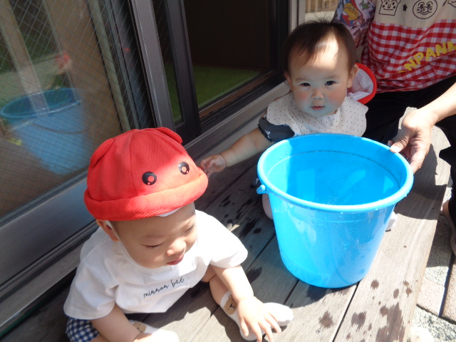 水をやりながら、葉っぱ🍃を触ったり土いじりが始まり、最後は手を洗う水で水遊びが始まりました。