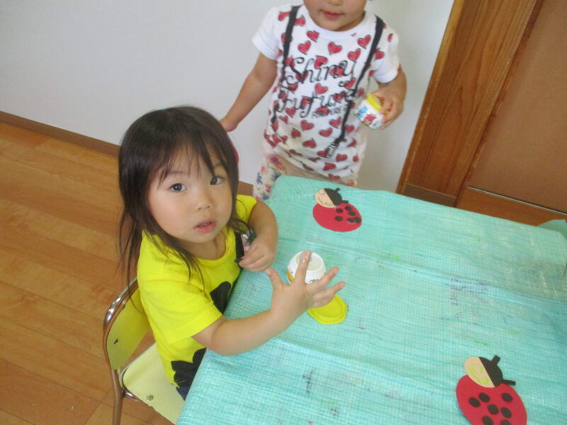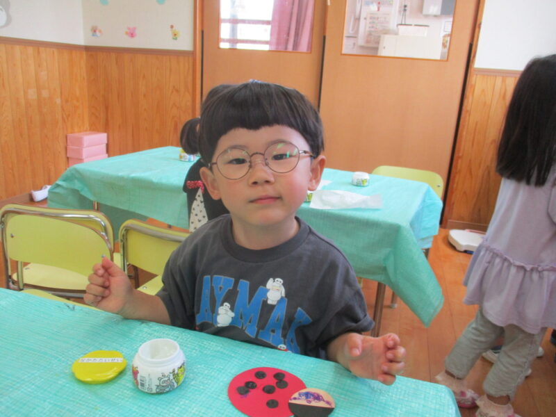 5月の製作「てんとう虫と四葉のクローバー」を糊で丁寧に貼り付けました。糊の付け方を一人ひとりに伝えたところ少しづつ指先につけていました。