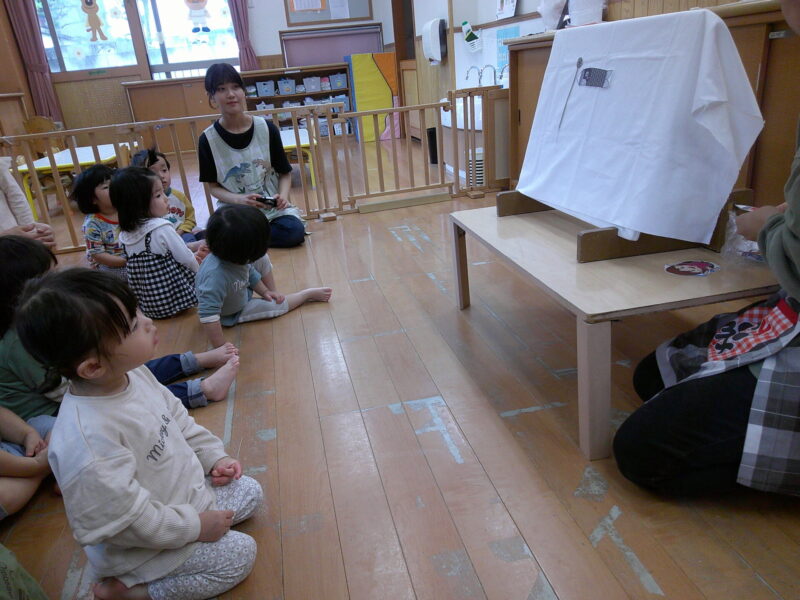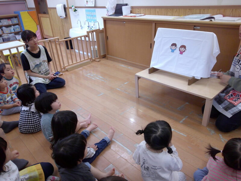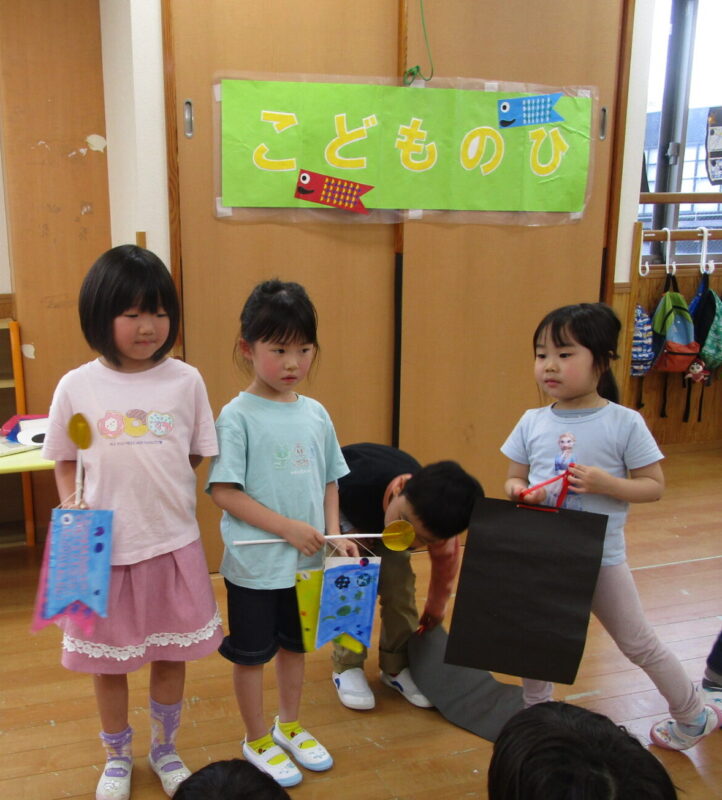 最初に「こどもの日って何?」という話をパネルシアターで見ました。どのクラスもとっても真剣に、パネルシアターを見ていましたよ。