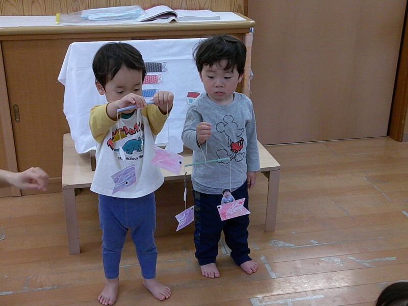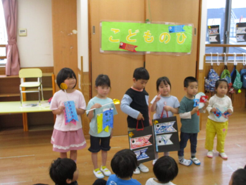 乳児クラス(みかん組、めろん組)と、幼児クラス(もも組、りんご組、ぶどう組)に分かれて、こどもの日の集いの集いを行いました。