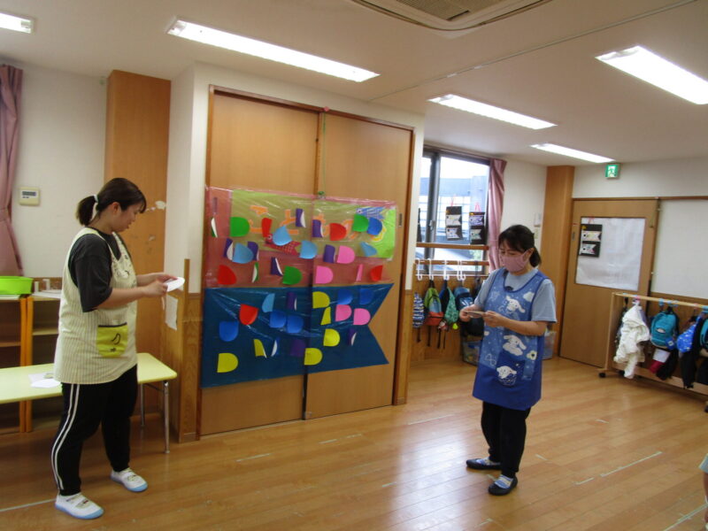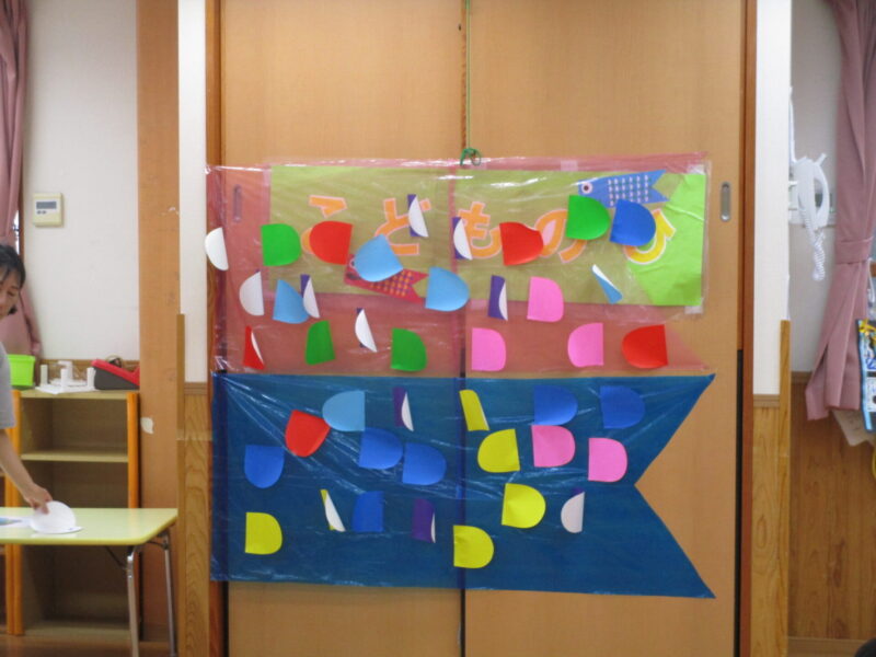 幼児クラスは、この後、「こいのぼりをおよがせよう!」というゲームを行いました。用意された大きなこいのぼりの形のカラーポリに、みんなでうろこを貼りました。最後は先生が目玉を貼って完成!出来上がると大きな拍手がわきました!!