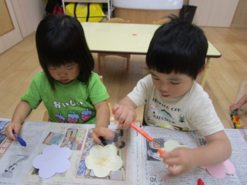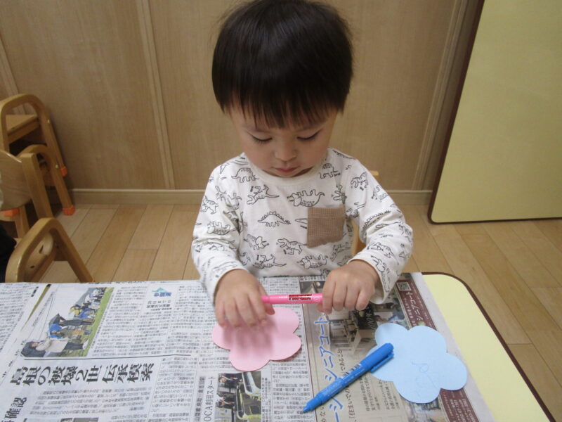 午前中はお花の形の画用紙に好きな色のサインペンを選んで、子どもたちそれぞれが思い思いにお絵描きをしました。
