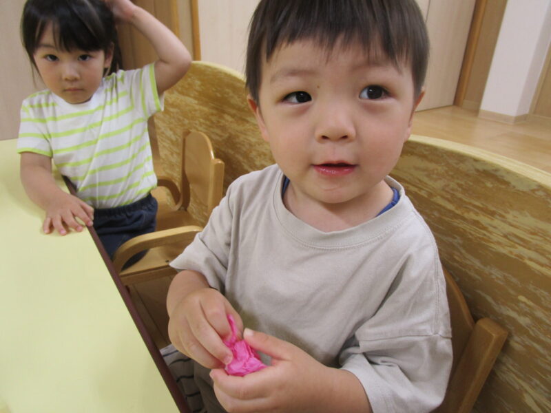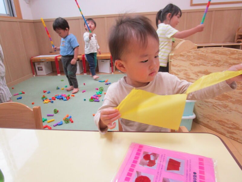 午後はお花紙をちぎっておにぎりのようにクシャクシャにしました。午前中のお花の一部に加わる予定です。