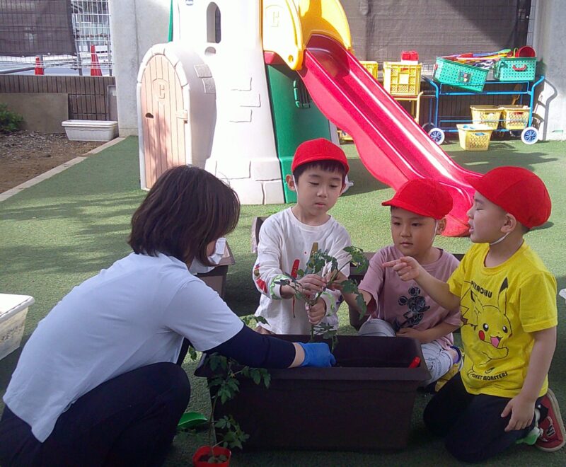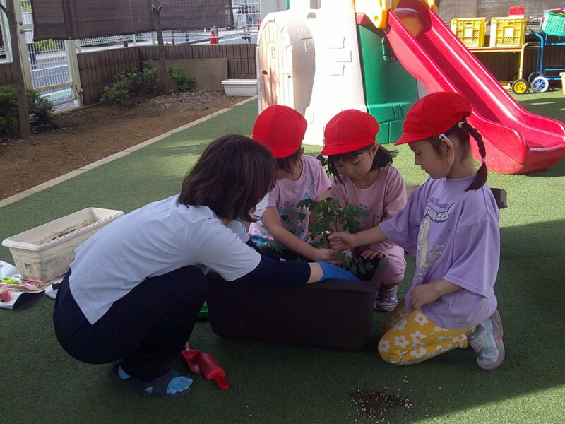 幼児組で夏野菜トマト・茄子・唐辛子・ほうれん草の苗植えを行いました。