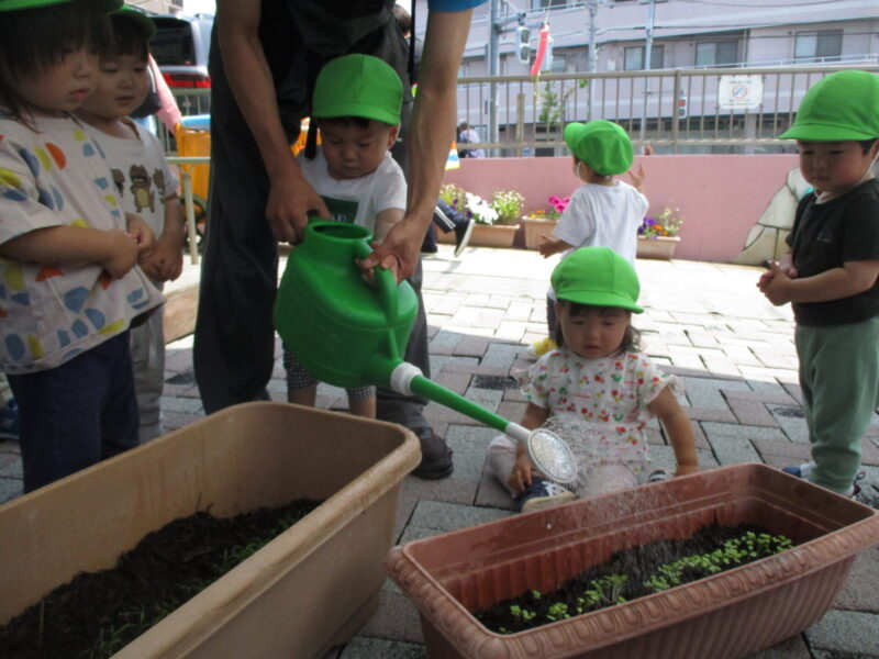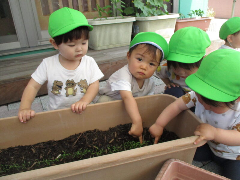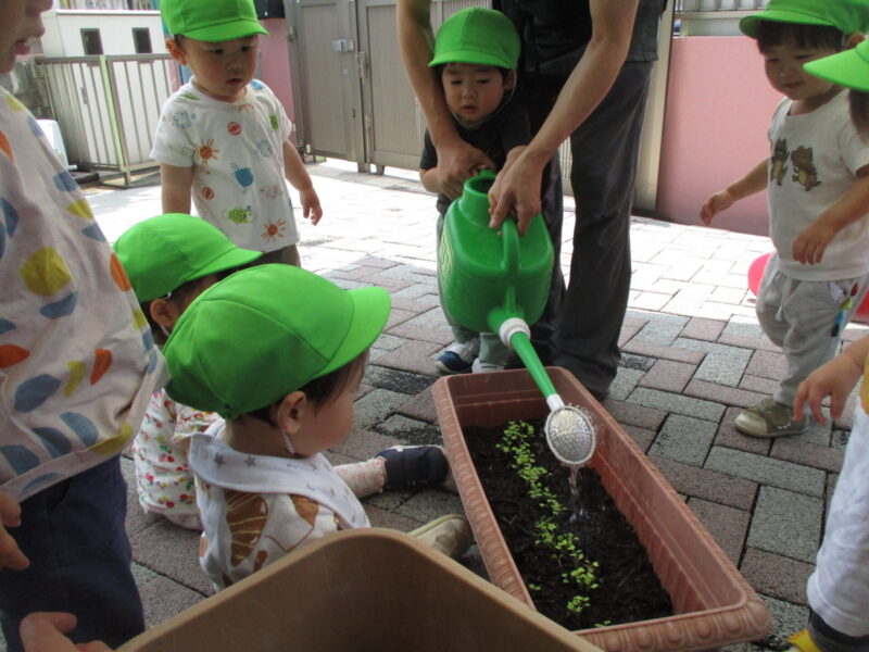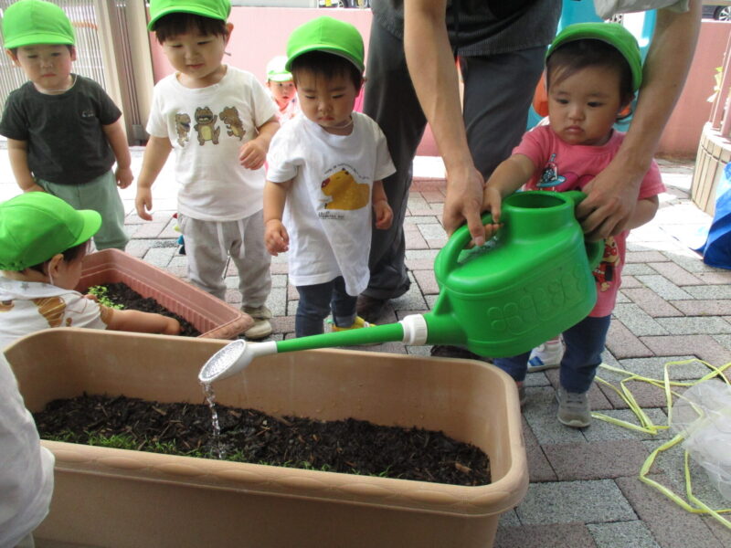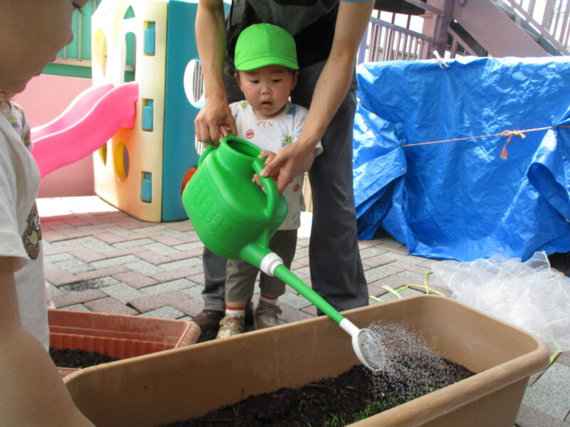 芽が出てきたのでみんなで観察をしたり、水やりをしました。