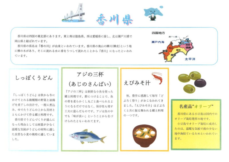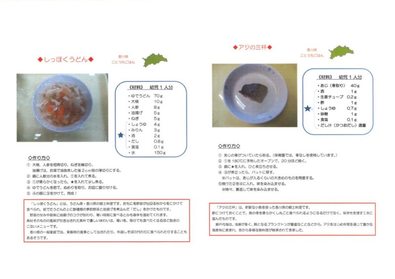 香川県のメニュー・給食は「かきまぜ・あじの三杯・さつまいもの甘煮・えびみそ汁・果物」おやつは「しっぽくうどん」です。「さつまいもが美味しかった」「魚も美味しいね」など会話が弾む給食です。