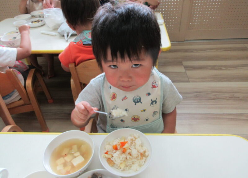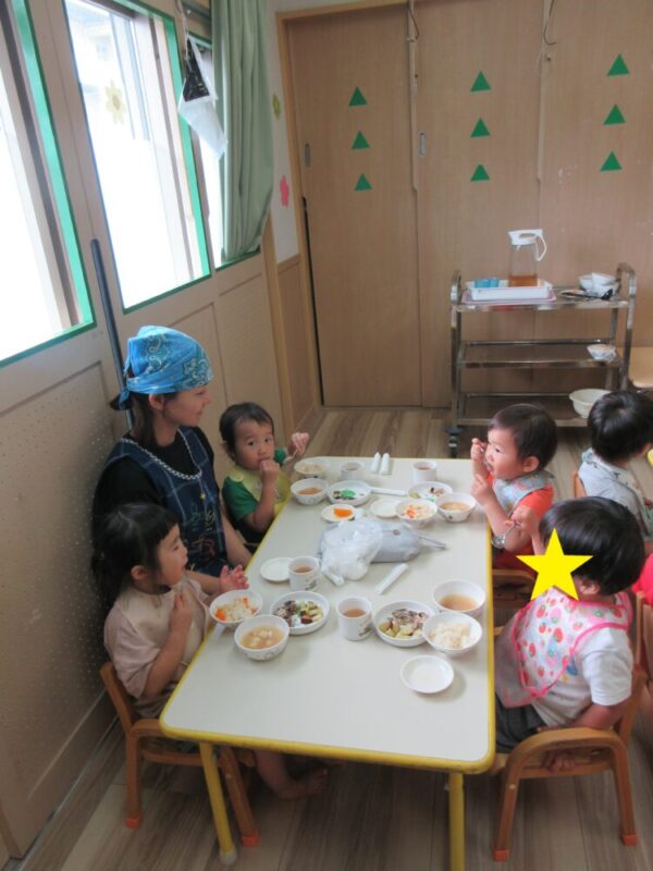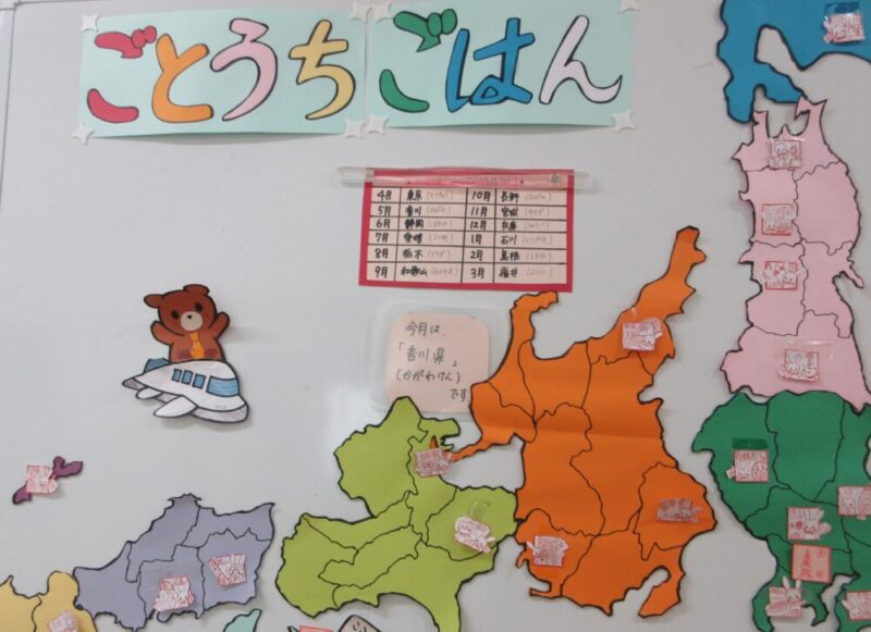 栄養士の先生が手作りで作ってくれる給食を通して、日本各地の料理を知ったり、行ってみたいと思ったり、実際にその県に行ったことがあるなど、幼児組では会話が弾む1日です。