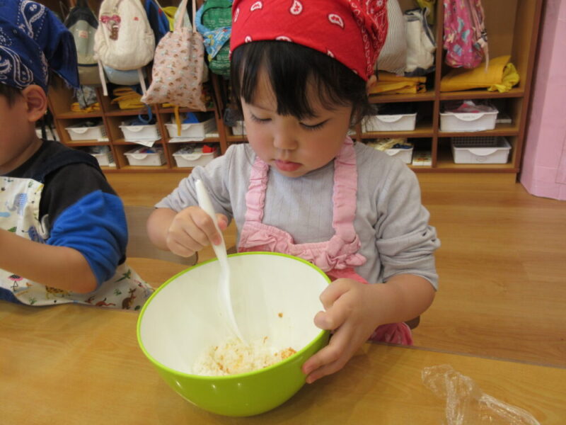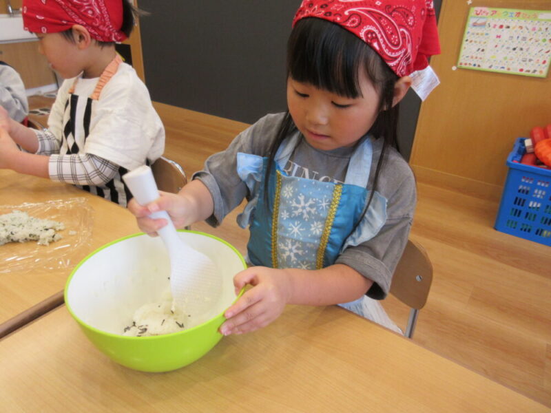 鮭フレーク、塩昆布、わかめの中から好きな具材を選んで1人ひとりボールで混ぜました!