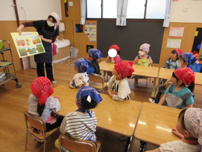 食育が始まるとまず栄養士さんからどのようにお米が作られているのかお話を聞きました!
