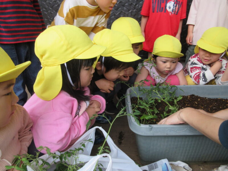トマトの実が小さく実っているのを見つけると「みて!ここトマトできてるよ!」と嬉しそうに目を輝かせている姿の子もいましたよ😊