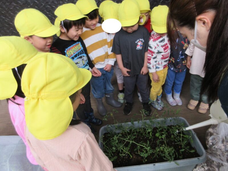トマトの実が小さく実っているのを見つけると「みて!ここトマトできてるよ!」と嬉しそうに目を輝かせている姿の子もいましたよ😊