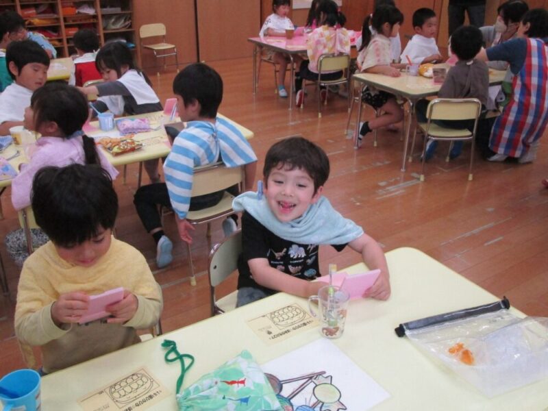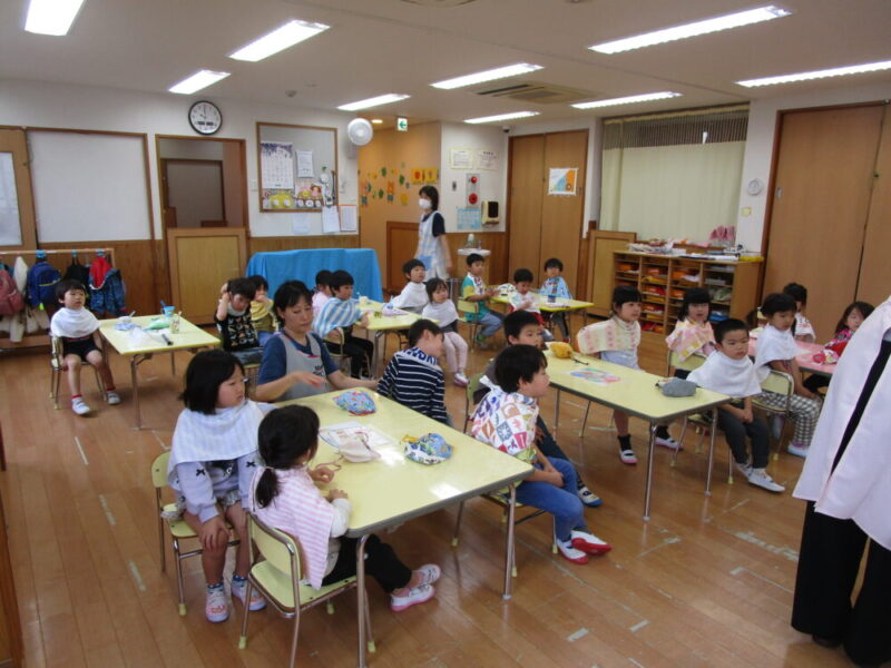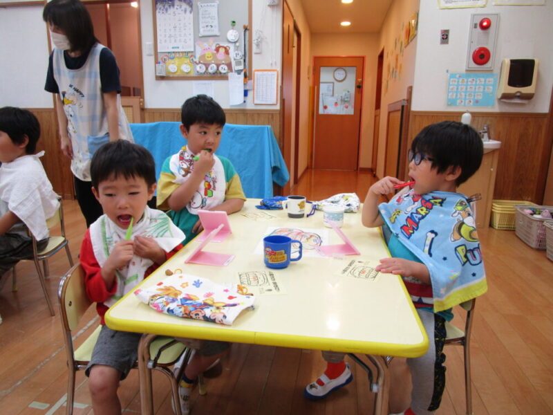 歯科衛生士よりプラークについての説明を聞いてからプラークチェッカーを使い歯垢チェックをしました。鏡を見ながらピンクに染まった部分を確認しブラッシング。歯ブラシの動かし方も教えて頂き、最後は隣のおともだちときれいになった歯を見せ合っていました。