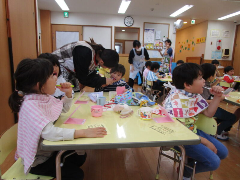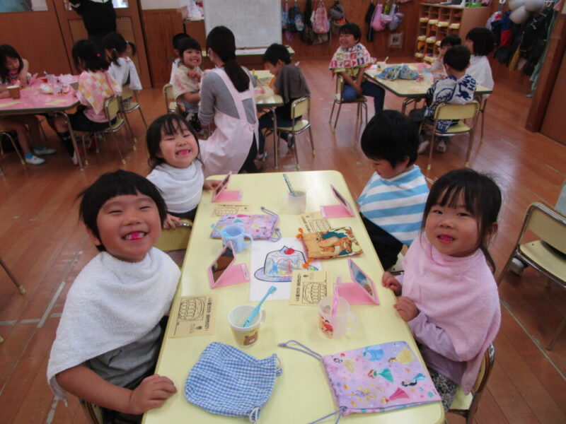 歯科衛生士よりプラークについての説明を聞いてからプラークチェッカーを使い歯垢チェックをしました。鏡を見ながらピンクに染まった部分を確認しブラッシング。歯ブラシの動かし方も教えて頂き、最後は隣のおともだちときれいになった歯を見せ合っていました。
