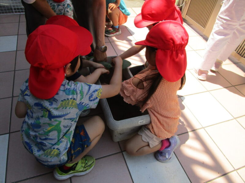 なすの苗をよく観察してから、プランターに土を入れ、そこに苗を置き、その上から土をかぶせました。土のかぶせかたをよく説明しなかったので、「ほら、土をかけたよ!」との声の方を見ると、葉っぱの上に綺麗に土が乗っていて笑ってしまいました。慌てて、改めて「苗の下の方に土をかけるんだよ」と説明しました。