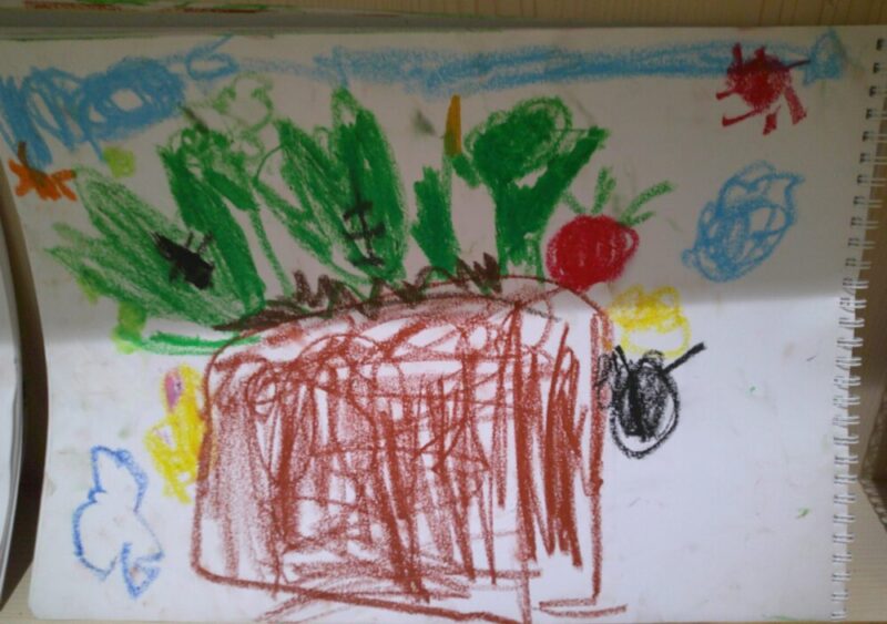 ミニトマトは実がなっていたり、虫が葉についていたりしました。丁寧に観察をし、素敵な絵が完成しました。