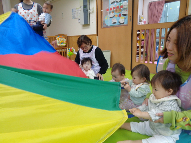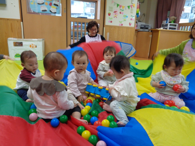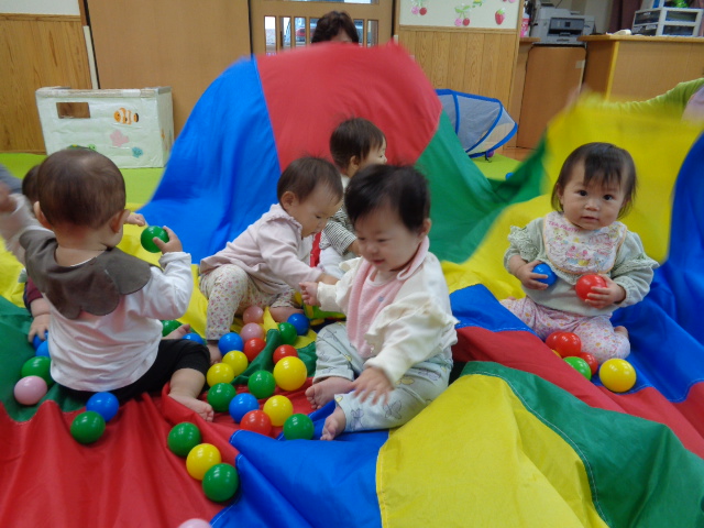この日はパラバルーン遊び♪先生達がふわ~っと広げると、最初は驚いていた子ども達もすぐに笑顔になりました。一緒に揺らしてみたりボールを乗せて遊んでいます。