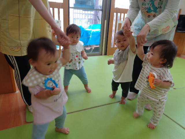 歩けるようになったお友達は音楽に合わせて、先生とお部屋の中をお散歩です。「1.2!」と元気に進んでいますよ♪