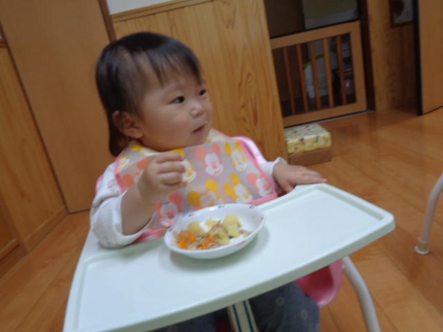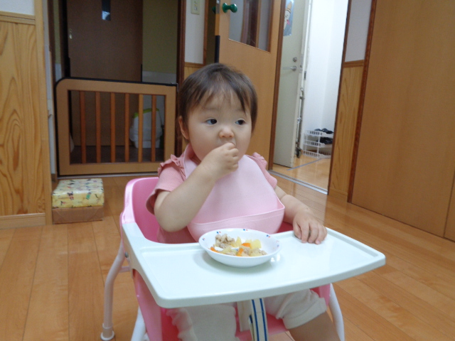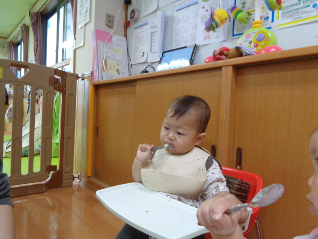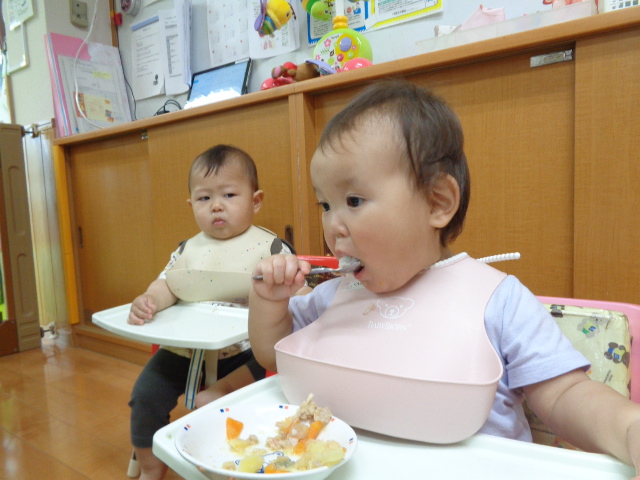 栄養士さんが作ってくれたおいしい給食を手づかみ食べやスプーンで食べることができるようになり、モリモリ食べています。