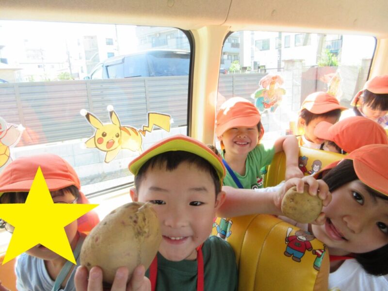 朝の登園から「手袋(軍手)もってきたよ~!!」とやる気満々の子どもたち!!・・・でしたが、炎天下で熱中症対策のため、掘ることはできませんでした💦特別にバスの中で”じゃがいも”に対する話や育て方について教えてもらいました😊