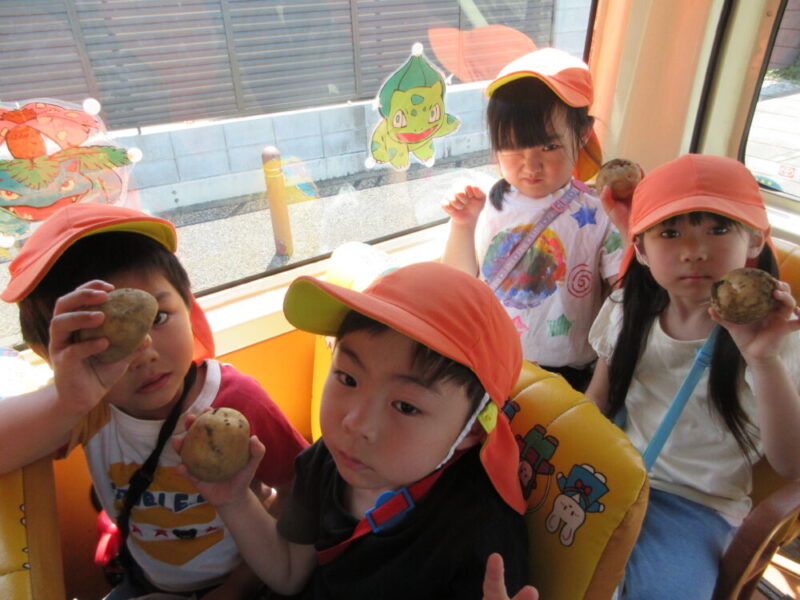 朝の登園から「手袋(軍手)もってきたよ~!!」とやる気満々の子どもたち!!・・・でしたが、炎天下で熱中症対策のため、掘ることはできませんでした💦特別にバスの中で”じゃがいも”に対する話や育て方について教えてもらいました😊