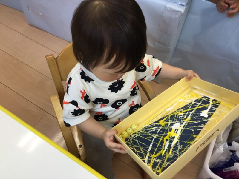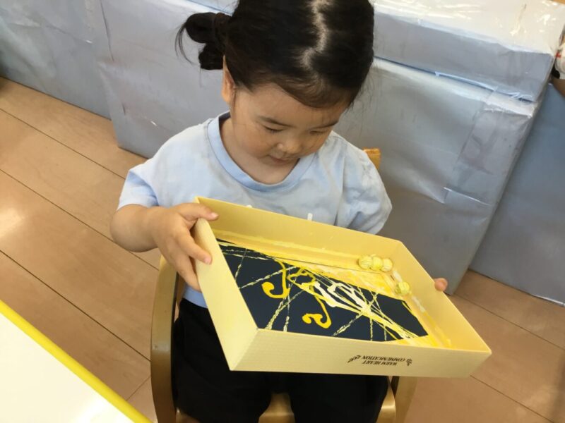 最初は箱を傾けるのが難しかったようですが、保育者と一緒に取り組む中で自分で箱を動かして上手に制作をしていました!