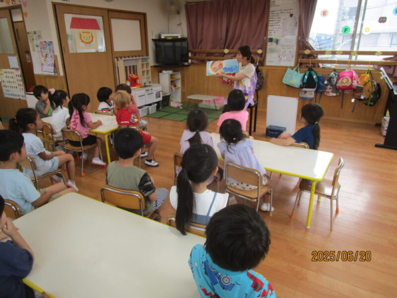 看護師さんが用意してくれた歯磨きの絵本やマグネットシアターを見ながら真剣にお話を聞いていました。