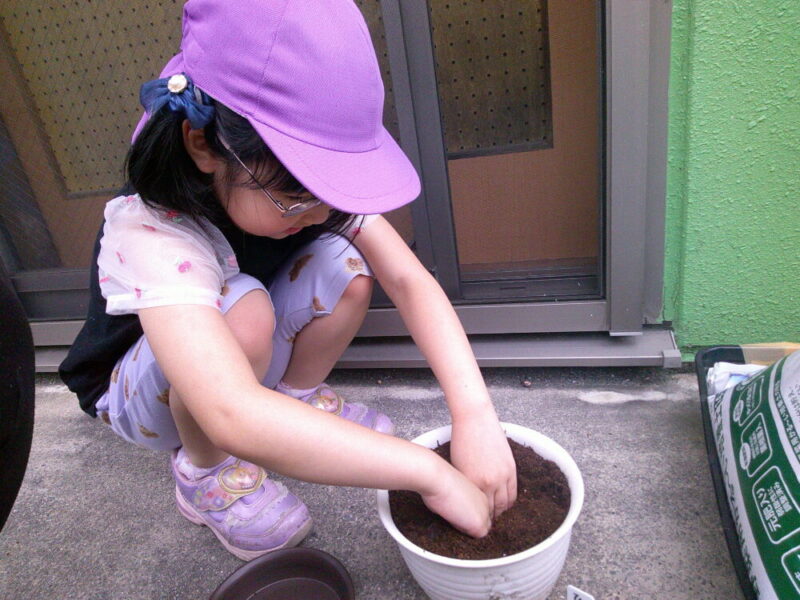 ひまわりの種を小さな植木鉢に丁寧に植えました。