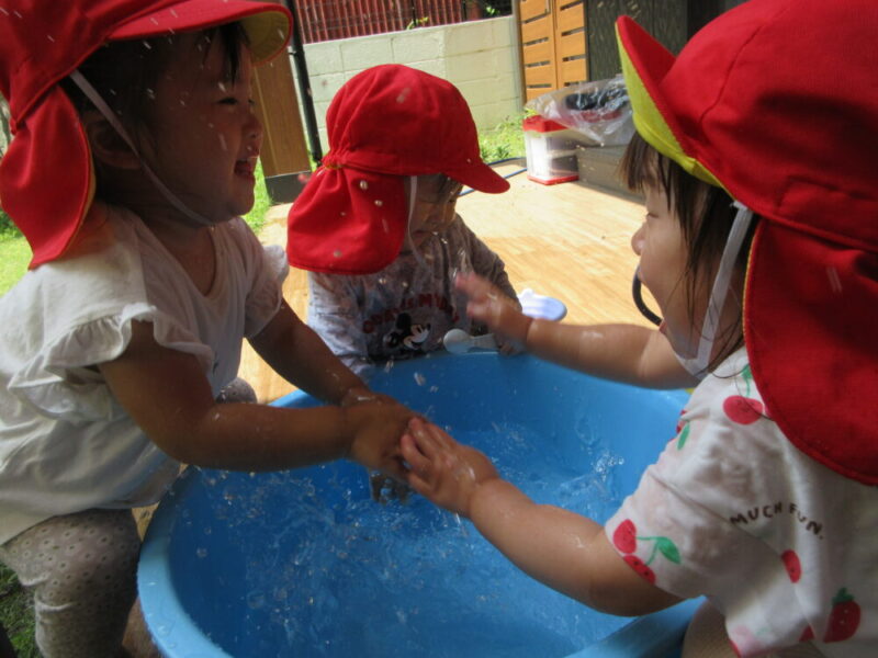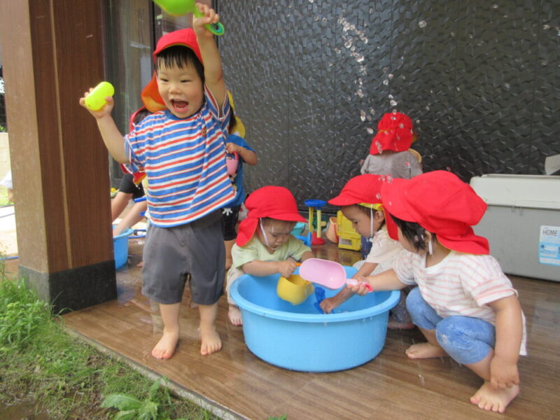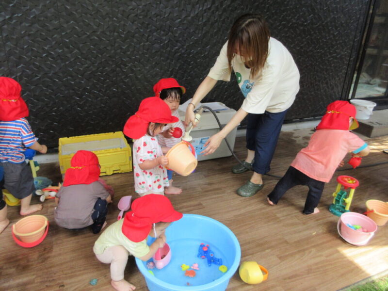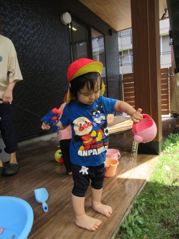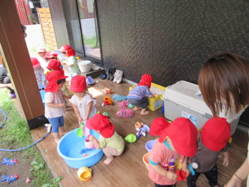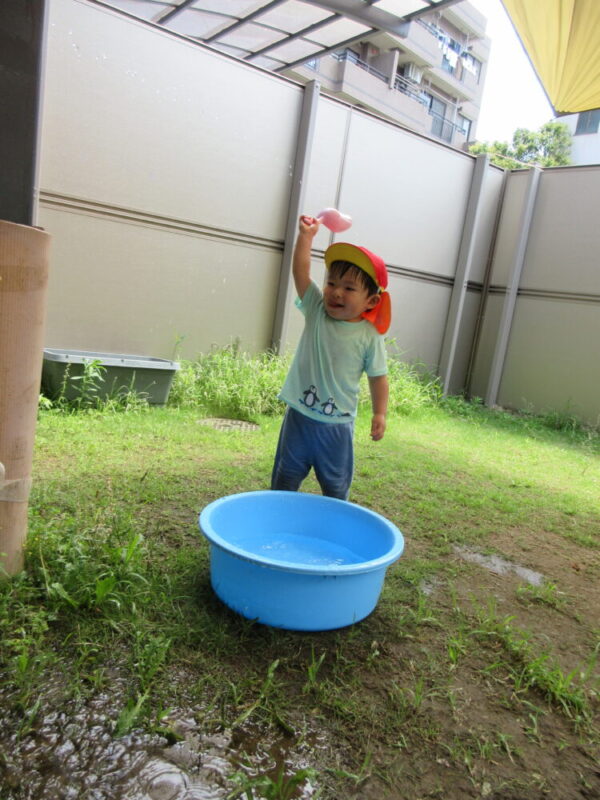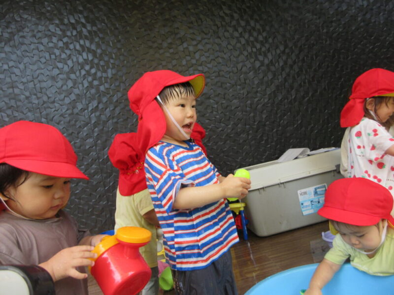 園でも水遊びが始まり、ばら組のお友だちも楽しんでいます!