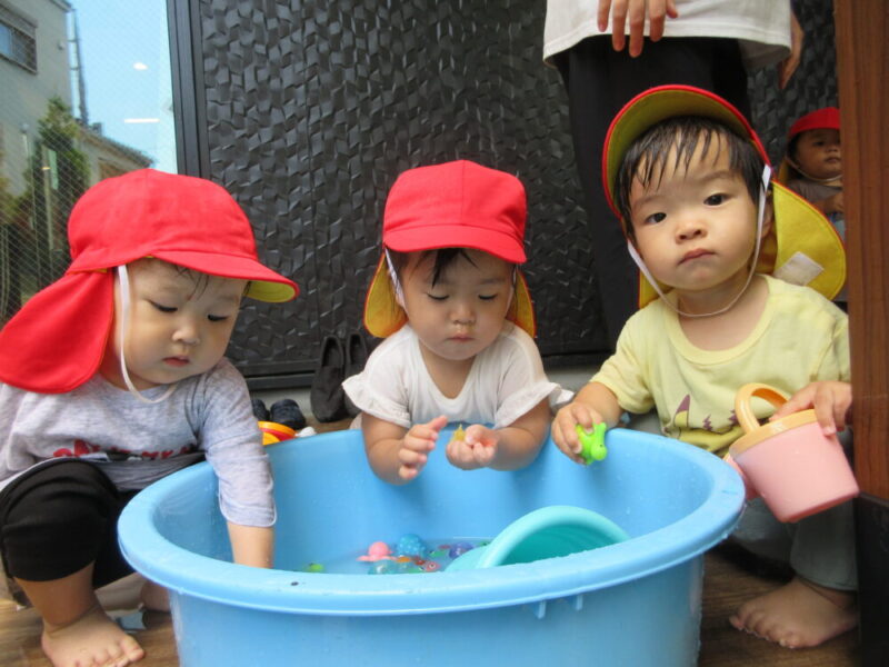 タライに溜まっている水に触れ、楽しそうな表情をしていたり、浮かんでいる玩具を真剣に掴もうとする表情が見られますね😊