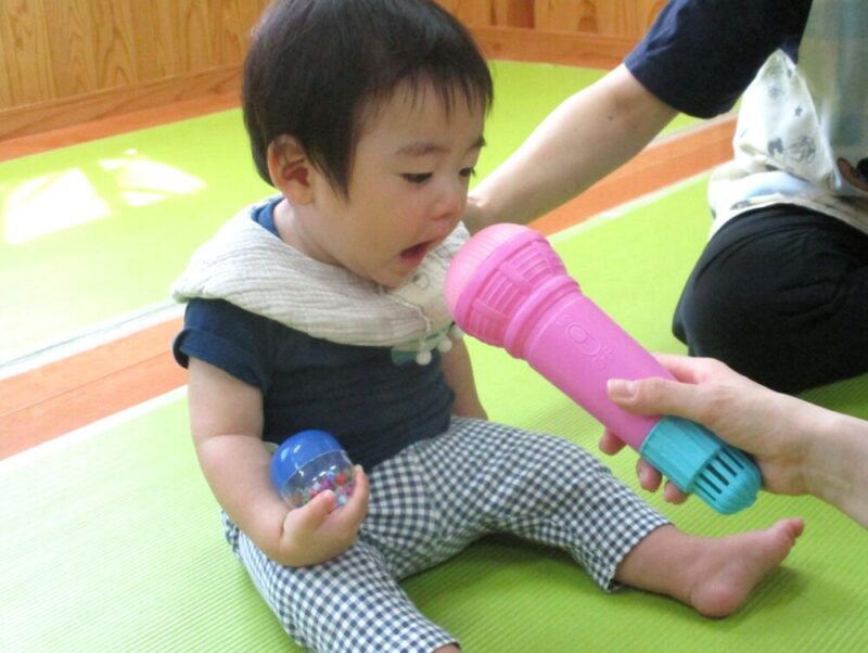 英語の音楽や歌に合わせて手遊びを楽しんだり、カプセルマラカスを使ったリズム遊びを楽しんでいます♪