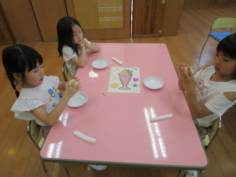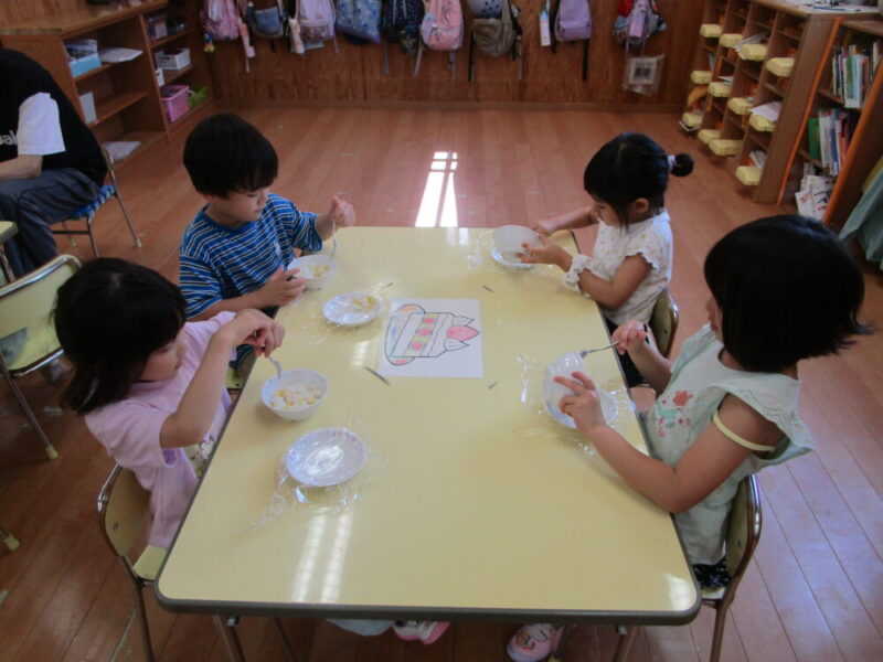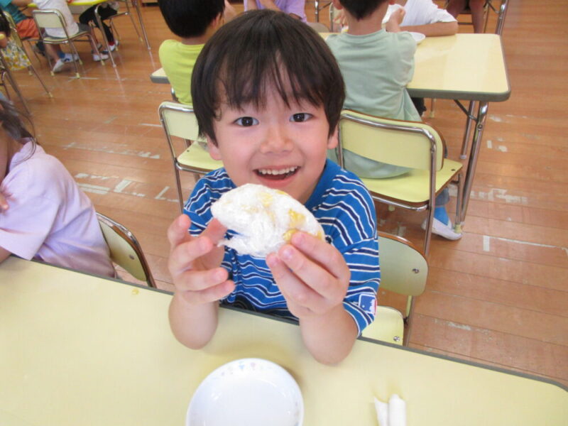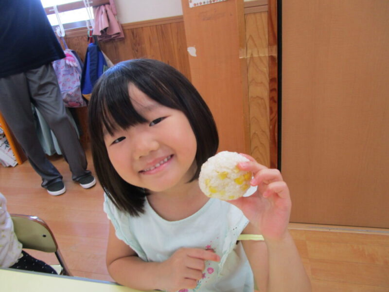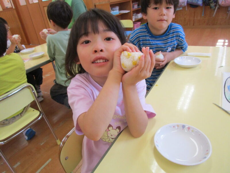 6月に食育でトウモロコシのおにぎりを作りました。栄養士の話をしっかりと聞き、調理開始です!