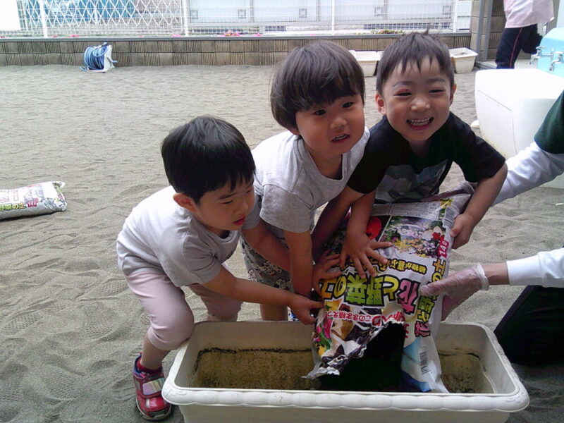 ②土を入れました!こちらもまた重たいですが「力持ちだから!💪✨」と頑張っていましたよ~🤭