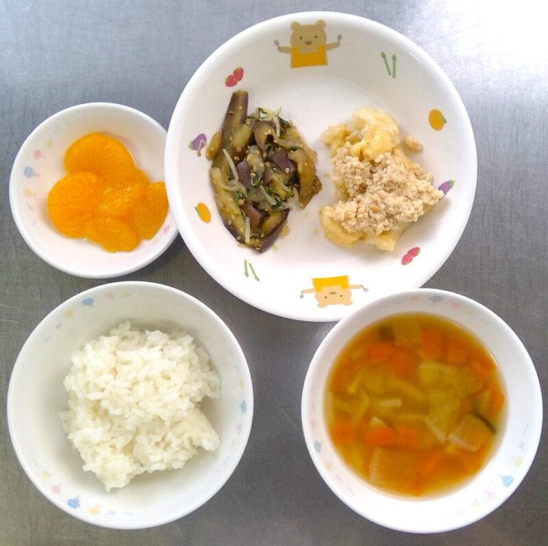 給食は、【味噌たれ揚げ豆腐】【なすのたたき】【おけんちゃ】【みかん缶】