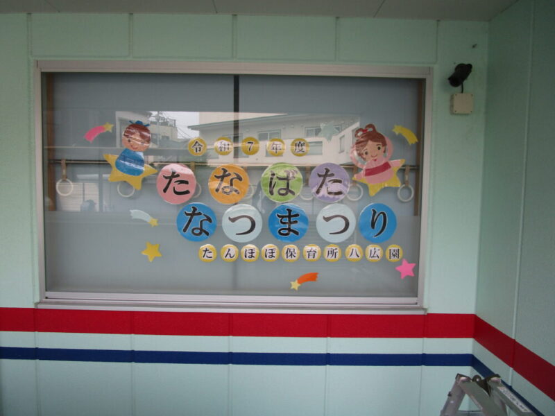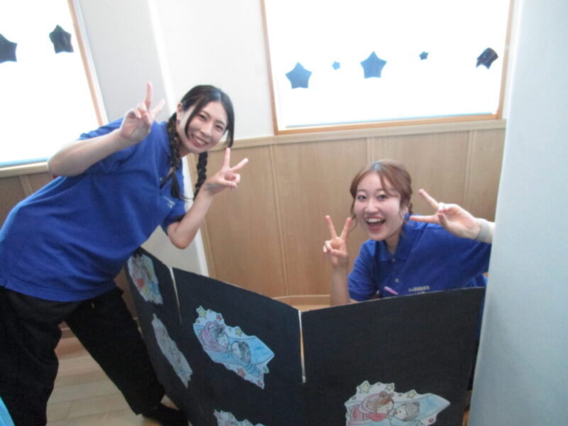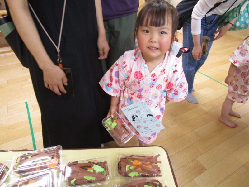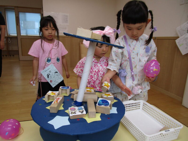 7月5日、七夕なつまつりが開催されました。園舎入口では、さっそく織姫様と彦星様がお出迎えです。