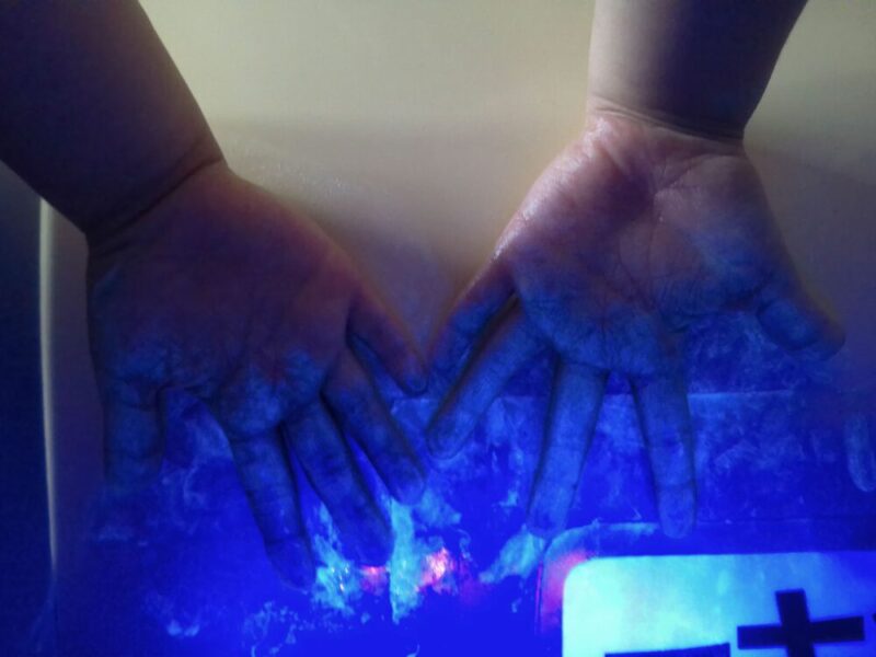 部屋を暗くして、手洗いチェッカーで見てみましょう🔍