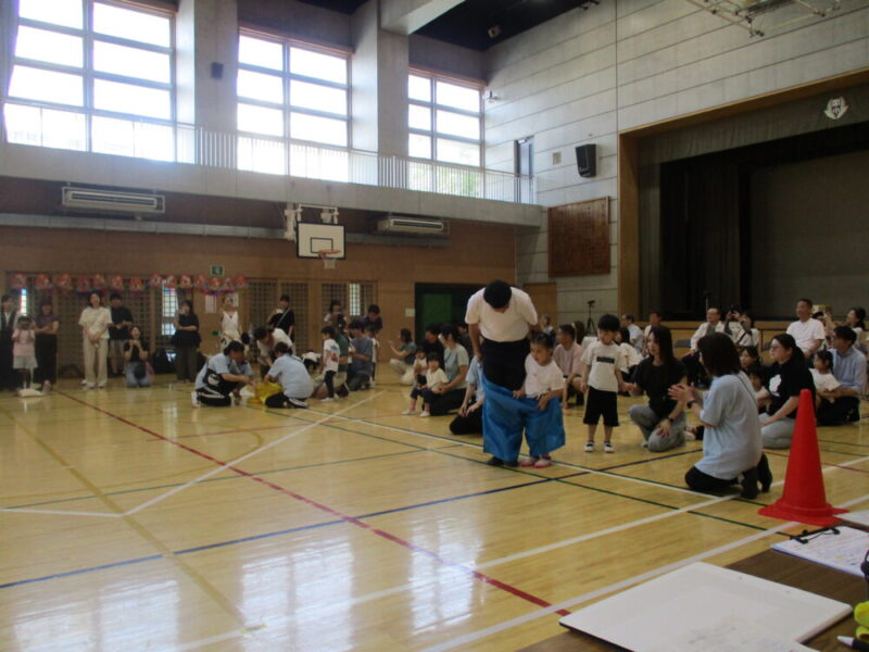 幼児クラス混合で行った親子競技「親子で主役だ頑張るぞ!」デカパンと呼ばれる大きなズボンに親子で入り進み、その先にあるバスタオルで風船を運ぶリレー方式で行いました。お家の方と一緒に参加でき、子ども達の嬉しい顔がたくさん見られました。