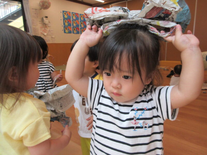 新聞紙を頭飾りにして、おしゃれを楽しむ可愛らしい子どもも♬