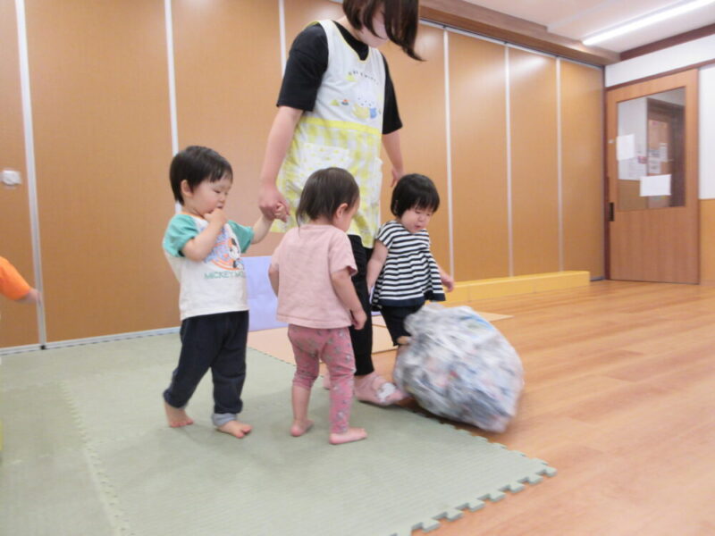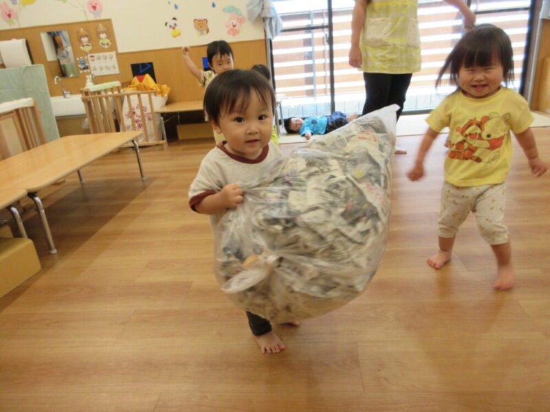 お片付けが終わり、新聞紙がたくさん入った袋を、大きなボールのようにして「ぽいっ!」と投げてみたり蹴ってみたりと身体を大きく使って最後まで楽しく遊びました😊♬
