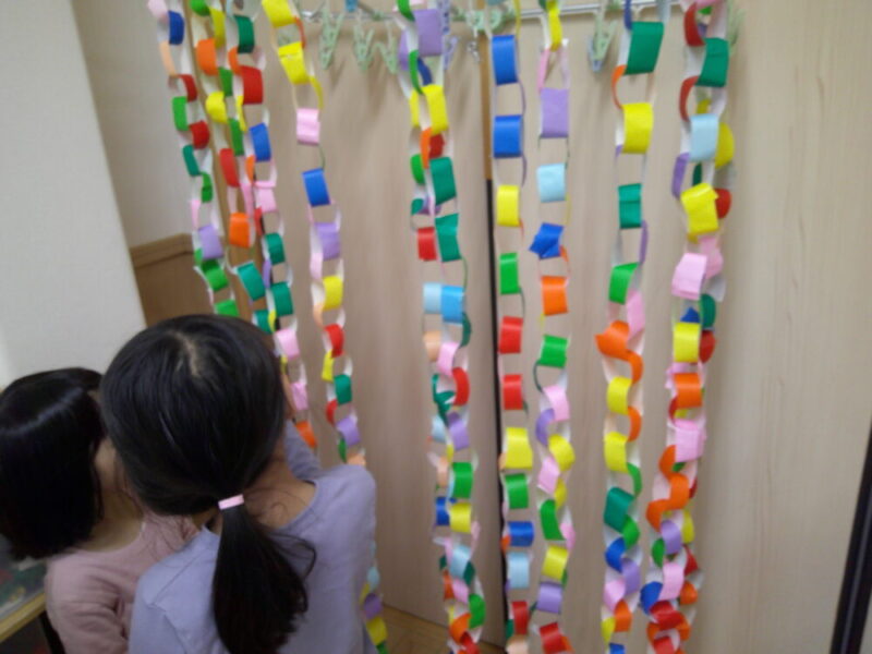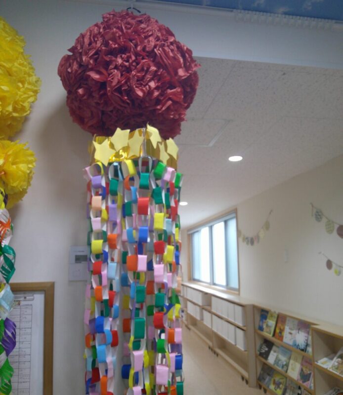 たいよう組は七夕夏まつに向けて以前紹介したかき氷と焼きそば、そして、『吹き流し』を作りました。
