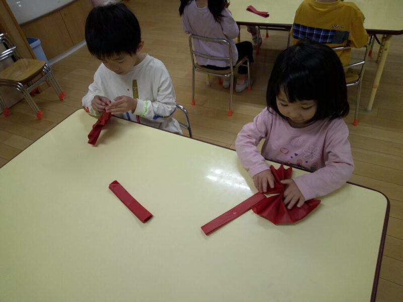 2か月前程から少しずつ作り始めました。吹き流しの上部分は子どもたちが、花紙を蛇腹に折り、お花を作りました。一枚ずつ花紙をめくるのが少し難しそうでしたが、集中して取り組んでいました。