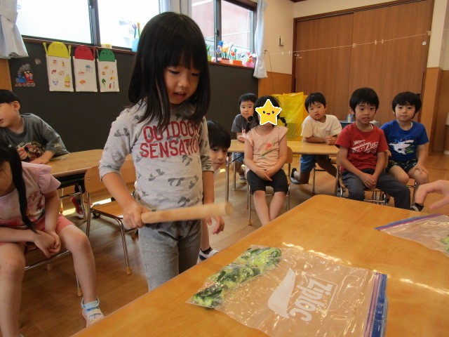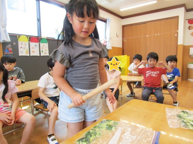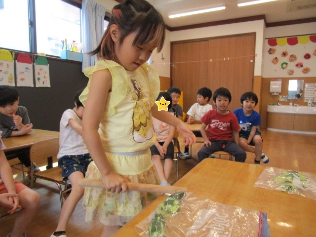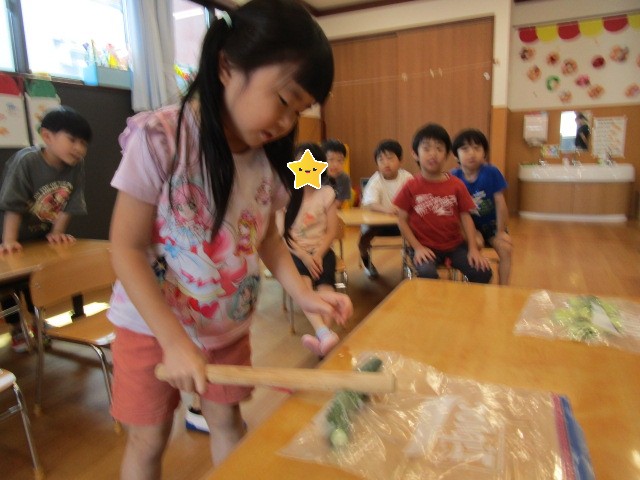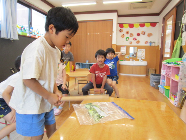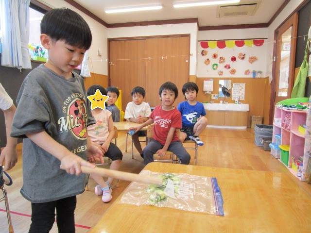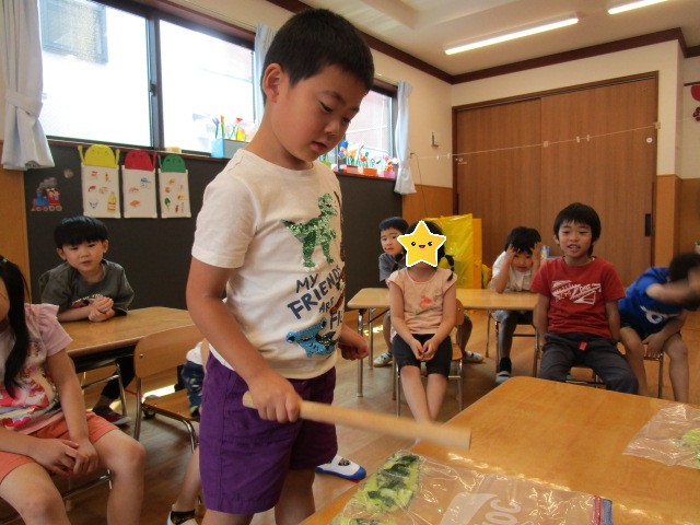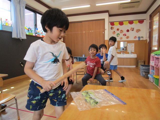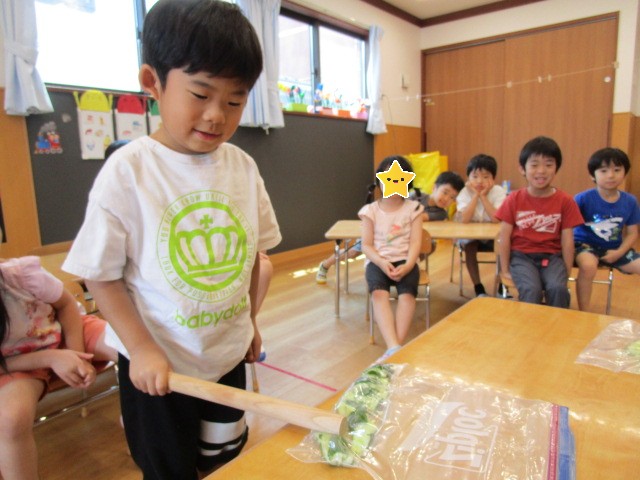 普段、保育園の中で棒を振ったり、棒で何かを壊したり潰したりすることがない子ども達は、目を輝かせて夢中できゅうりを叩いていました😂