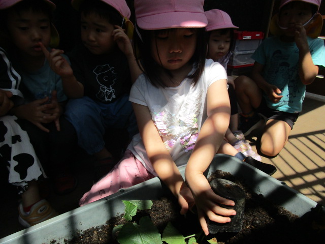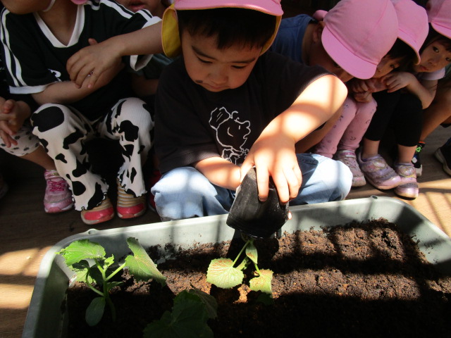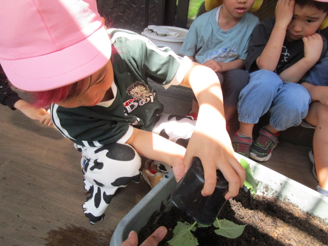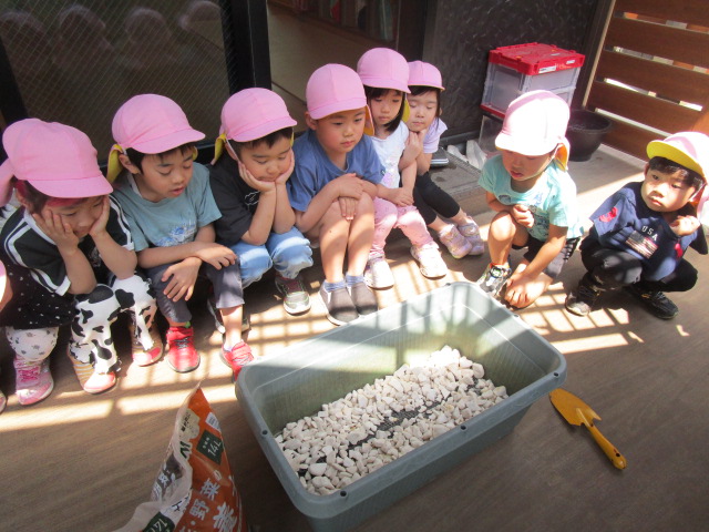 プランターの中は土だけだと思っていた子ども達は、一番下に石を入れることに驚き、「なんで石をいれるの?」「どうしてだろう?」とお友達と理由を考える姿が見られました😊
