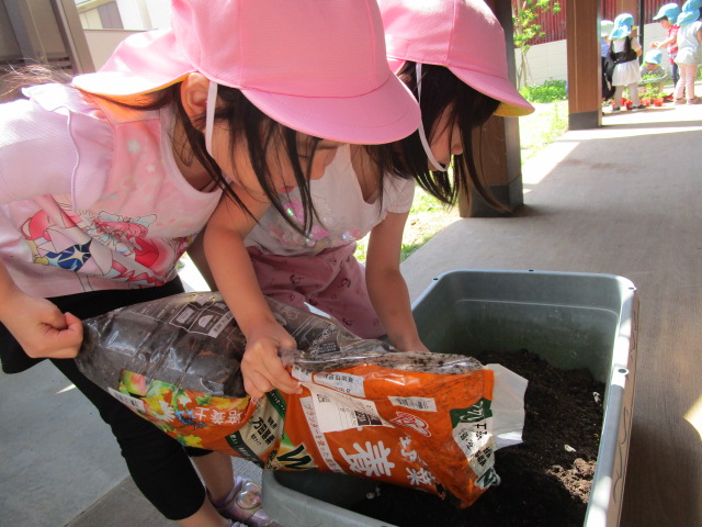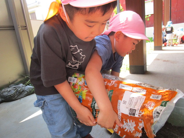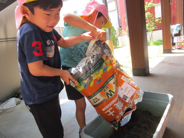 残念ながらこの日はお休みのお友達が多く、子ども達は「お休みの子たちの分も!!」とみんなで力を合わせて、重たい土の袋を何度も持ち上げプランターに入れていました。