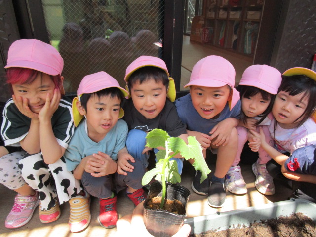 きゅうりを育てることが決まったさくら組の子ども達は、同じ時期にトマトを育てるひまわり組の子ども達と一緒にそれぞれの苗を買いに行きました🎵
